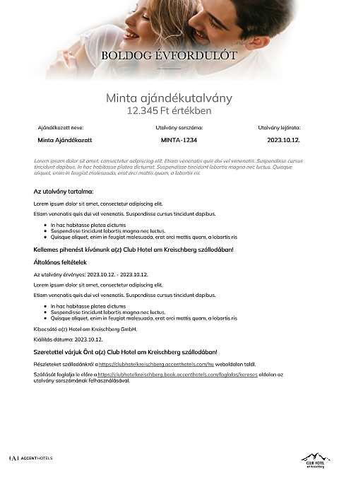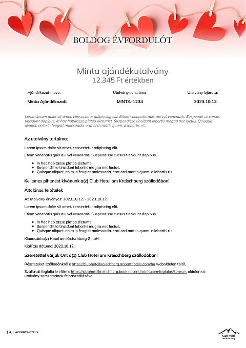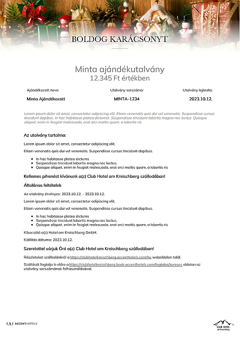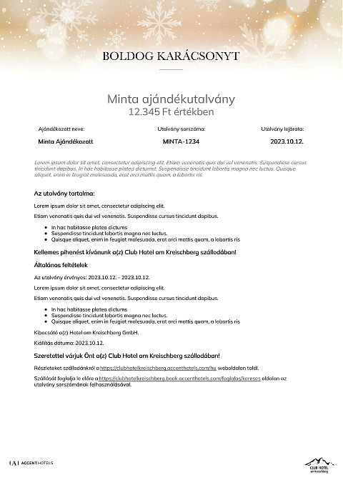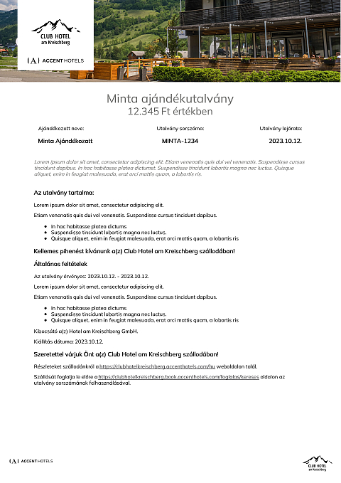 Az utalvány a Club Hotel am Kreischberg szállodában váltható be minden olyan számla részben vagy egészében történő fizetésére, melyen legalább egy éjszaka szállás is szerepel.