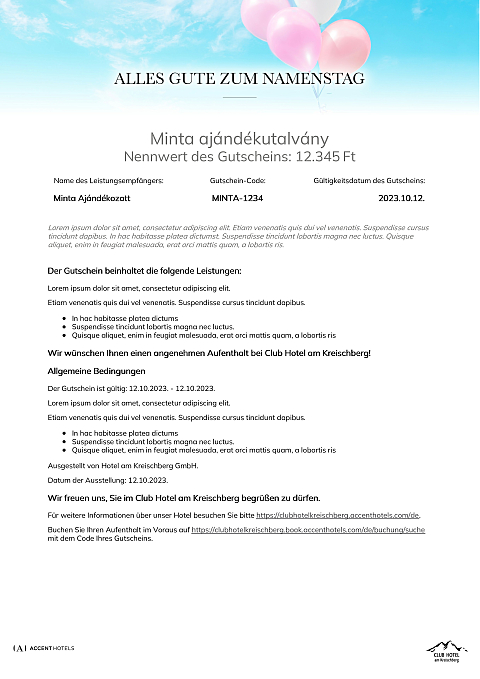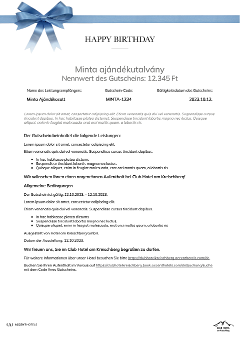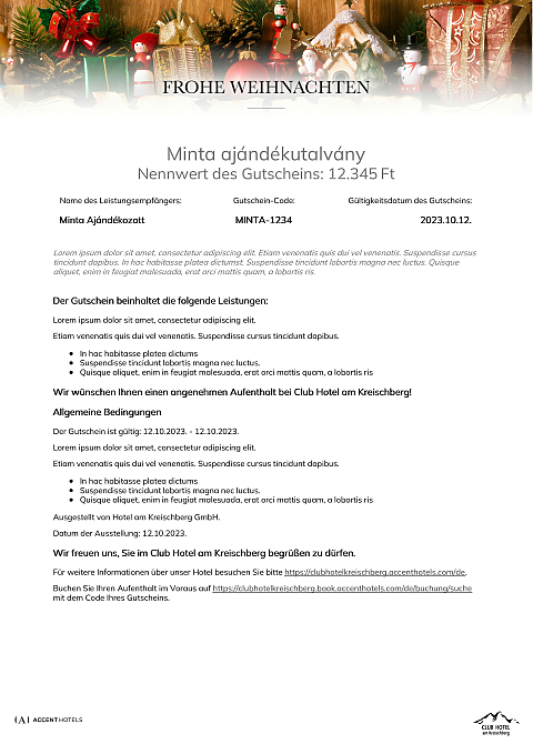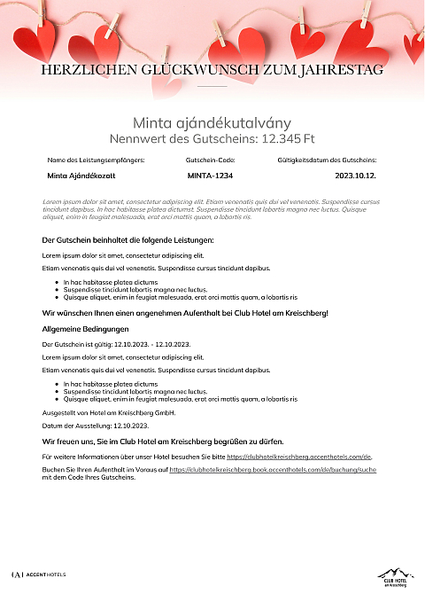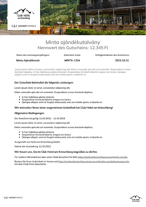 Der Gutschein kann im Club Hotel am Kreischberg zur vollständigen oder teilweisen Bezahlung einer Rechnung, die mindestens eine Übernachtung beinhaltet, eingelöst werden.